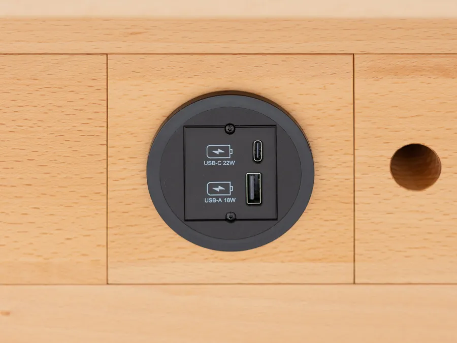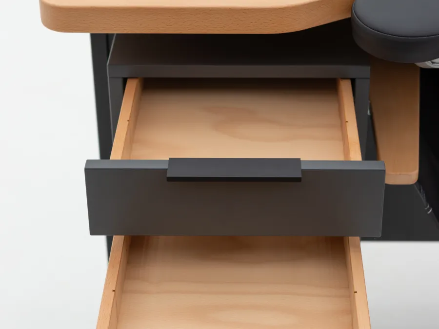 Containers and drawers - clever & smart. Lightweight and quiet-running full-extension runners with self-closing mechanism, combined with high-quality solid wood drawers, ensure a tidy workspace thanks to their flexible organization.