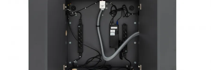 Ordnung mit System: Die Rückwand bietet zentralen Zugriff auf die gesamte Technik. Kabel und Absaugschläuche sind von hinten leicht zugänglich und an einem Ort gebündelt – für einen aufgeräumten, störungsfreien Arbeitsplatz.