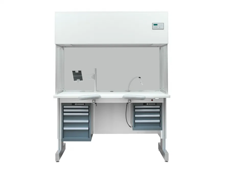 Height rush: The stable and stylish MODULAR III - as a cleanroom workbench - with a two-column aluminum table frame can achieve an electrical height adjustment range of 400 mm with its total lifting force of 400 kg!