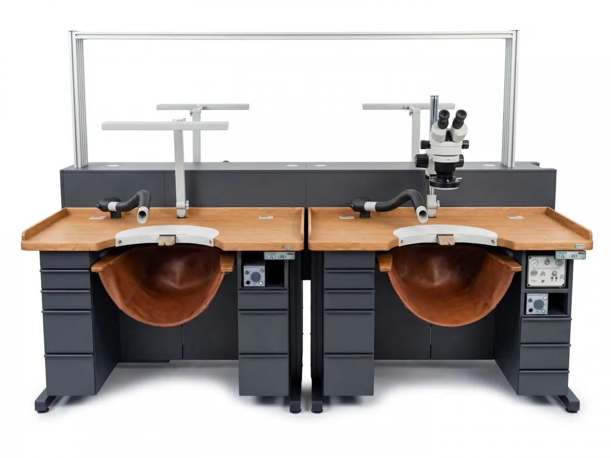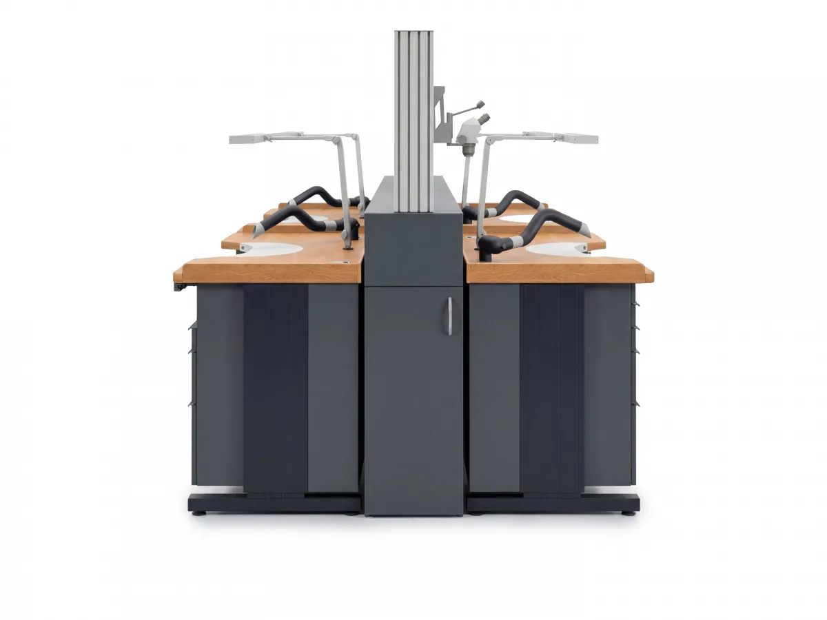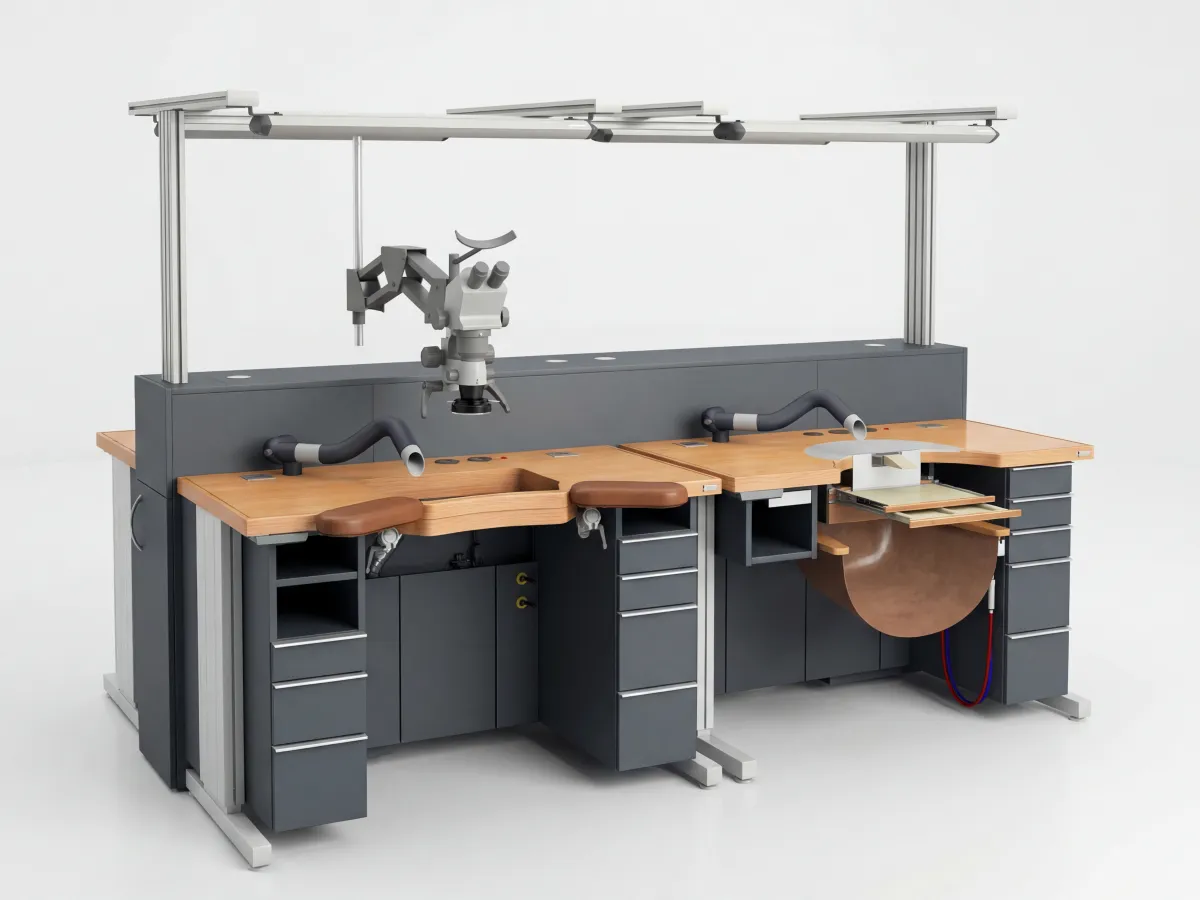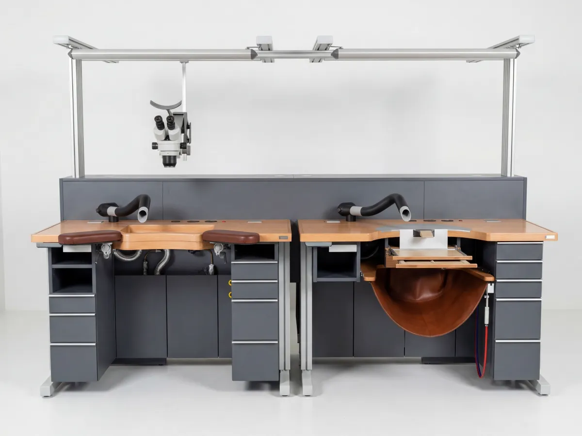 Am Werktisch-Überbau ist die Beleuchtung integriert und ein verschiebbares Mikroskop aufgehängt.