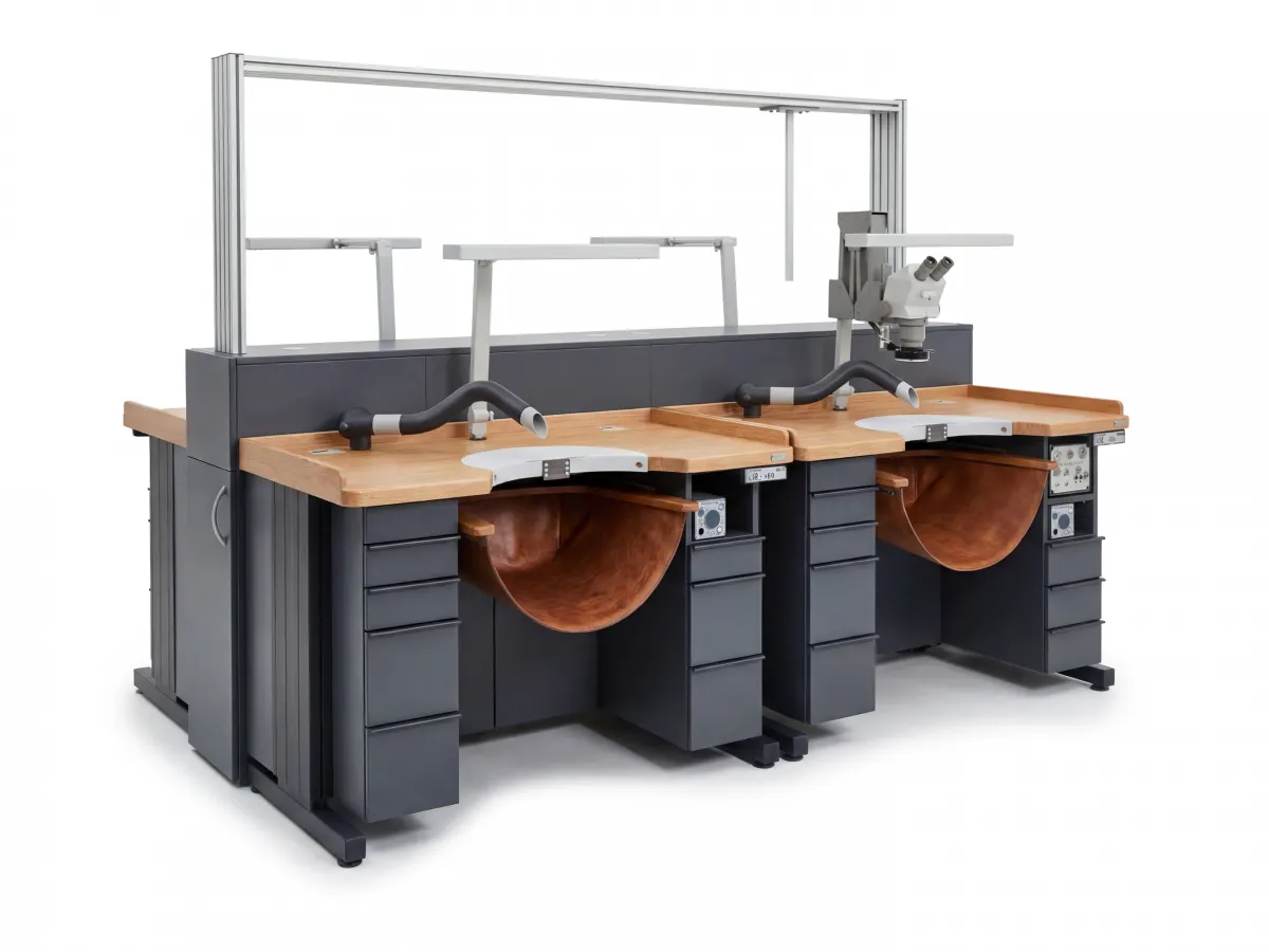 Die autarke Goldschmiedeinsel kann flexibel mitten im Raum platziert werden. Im Mittelteil befindet sich der unsichtbare Technikbereich, in dem Gas- und CO2-Flaschen integriert werden können. Auch der Kompressor sowie die Mehrplatz-Absauganlage sind dort untergebracht.