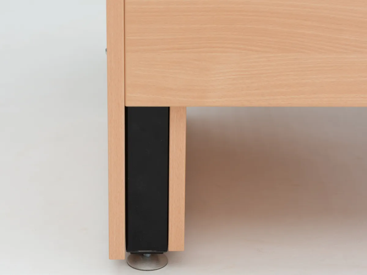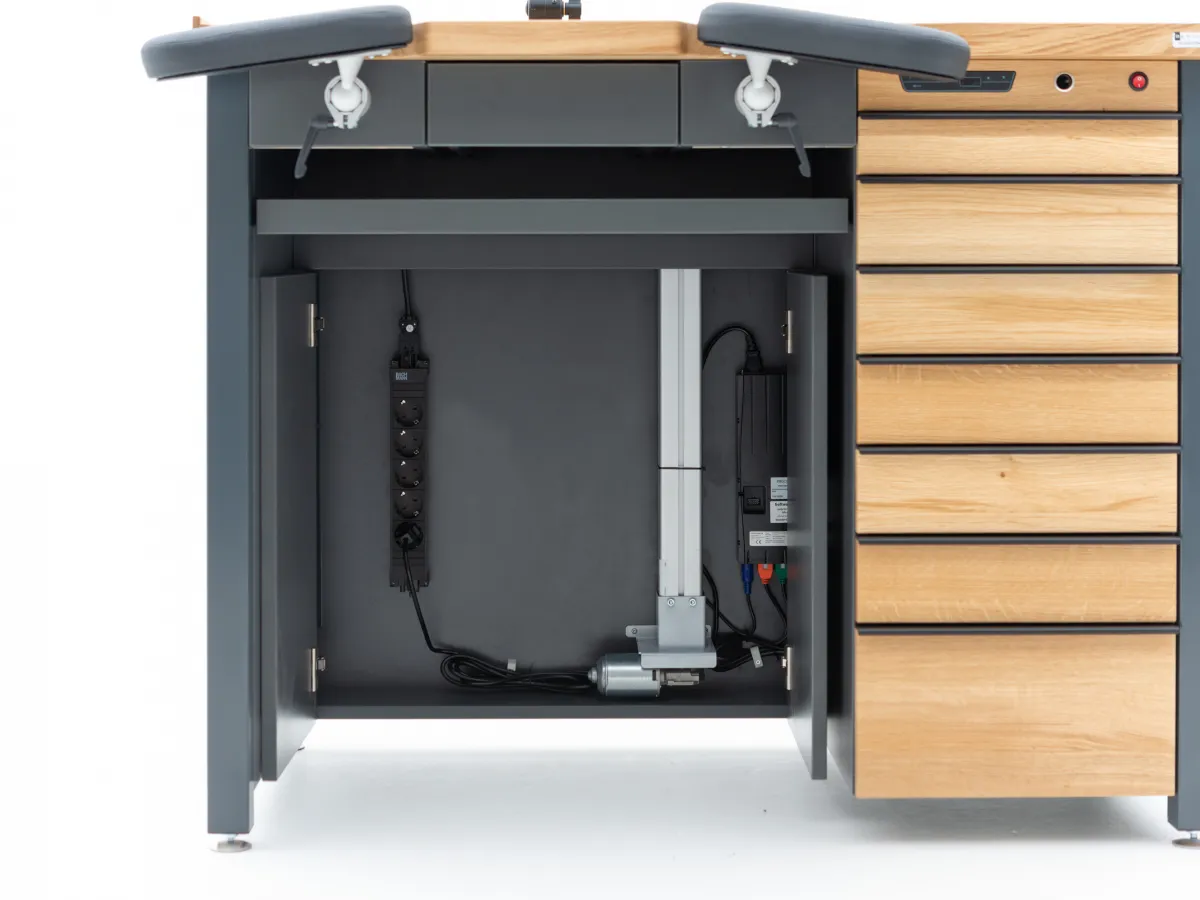 Das "MODULAR I" Tischgestell bietet mit seinem funktionalen, stabilen Design und den geschlossenen Rück- und Seitenwänden maximale Flexibilität. Es ist mit vier Hydraulikzylindern ausgestattet, die eine Hubkraft von jeweils 150 kg haben. Diese ermöglichen das Anheben des gesamten Tisches und aller Anbauteile durch einfaches Ausfahren der inneren Tischbeine.