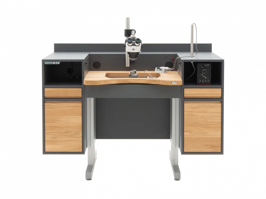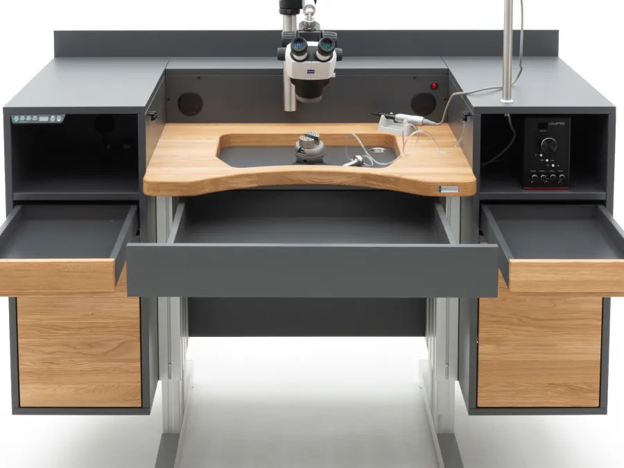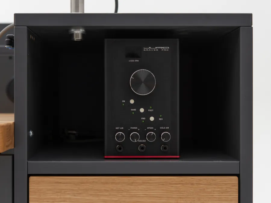 Der Fassertisch UNIQUE XIV ist das Ergebnis konsequenter Kundenorientierung. Jedes Detail wurde exakt auf spezifische Arbeitsabläufe abgestimmt. Maschinen und Werkzeuge – wie der Graver oder die Absaugung – haben ihren fest definierten Platz, um maximale Effizienz und